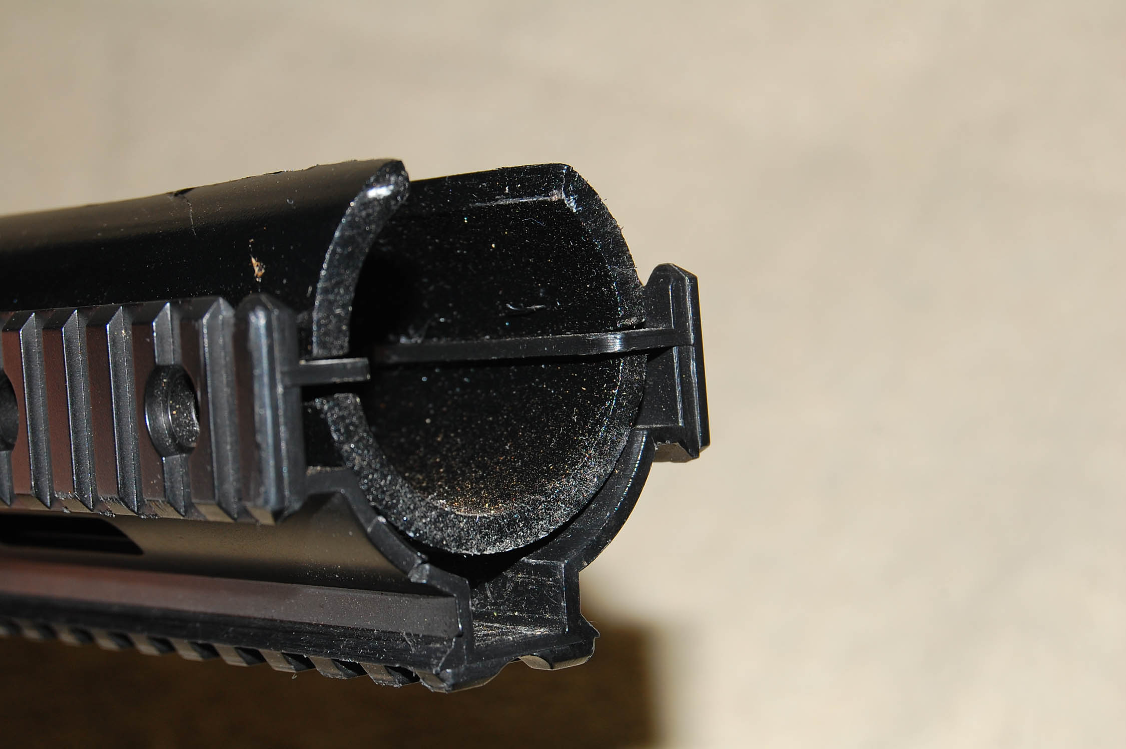 Take the whole rail system assembly and slide it carefully onto the gun. It won't slide on real easy, but you shouldn't have to force it. Make sure that you slide it on at an angle as shown below.