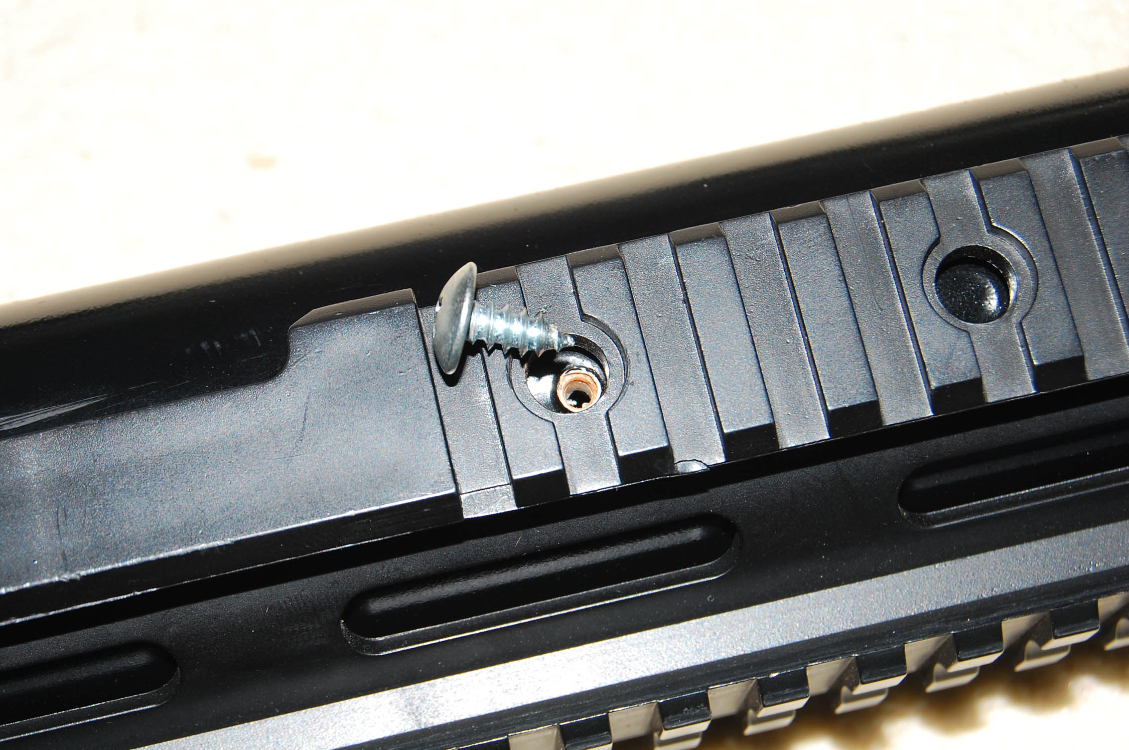 Use your drill and drill a hole in the middle of the rail hole (use the rail hole that is closest to the gun reciever. Also make sure that the drill bit is smaller that the thread on the screws). Now take your half-inch screws and screw them into the holes (make sure the screws are not too long or they will damage the gun).