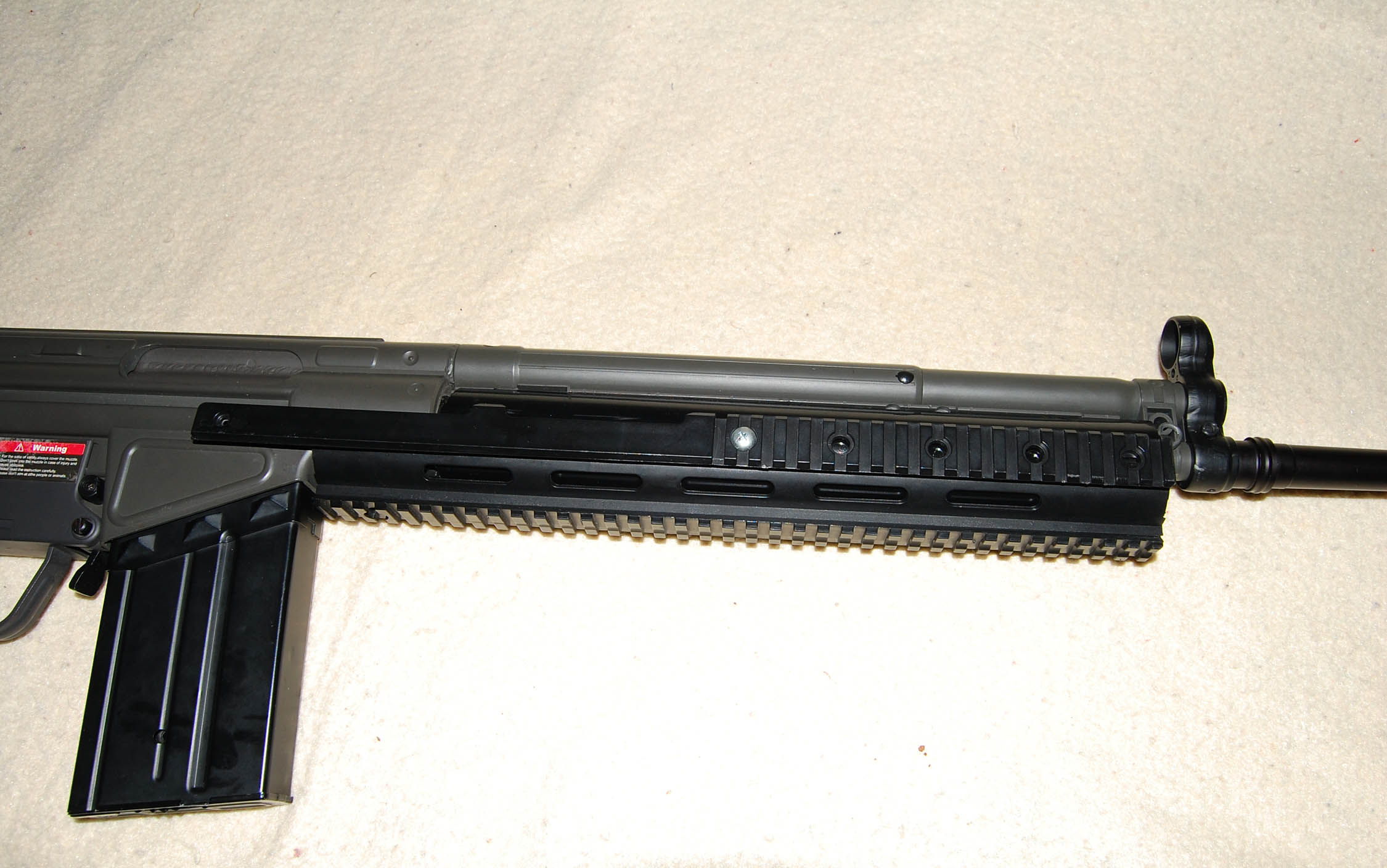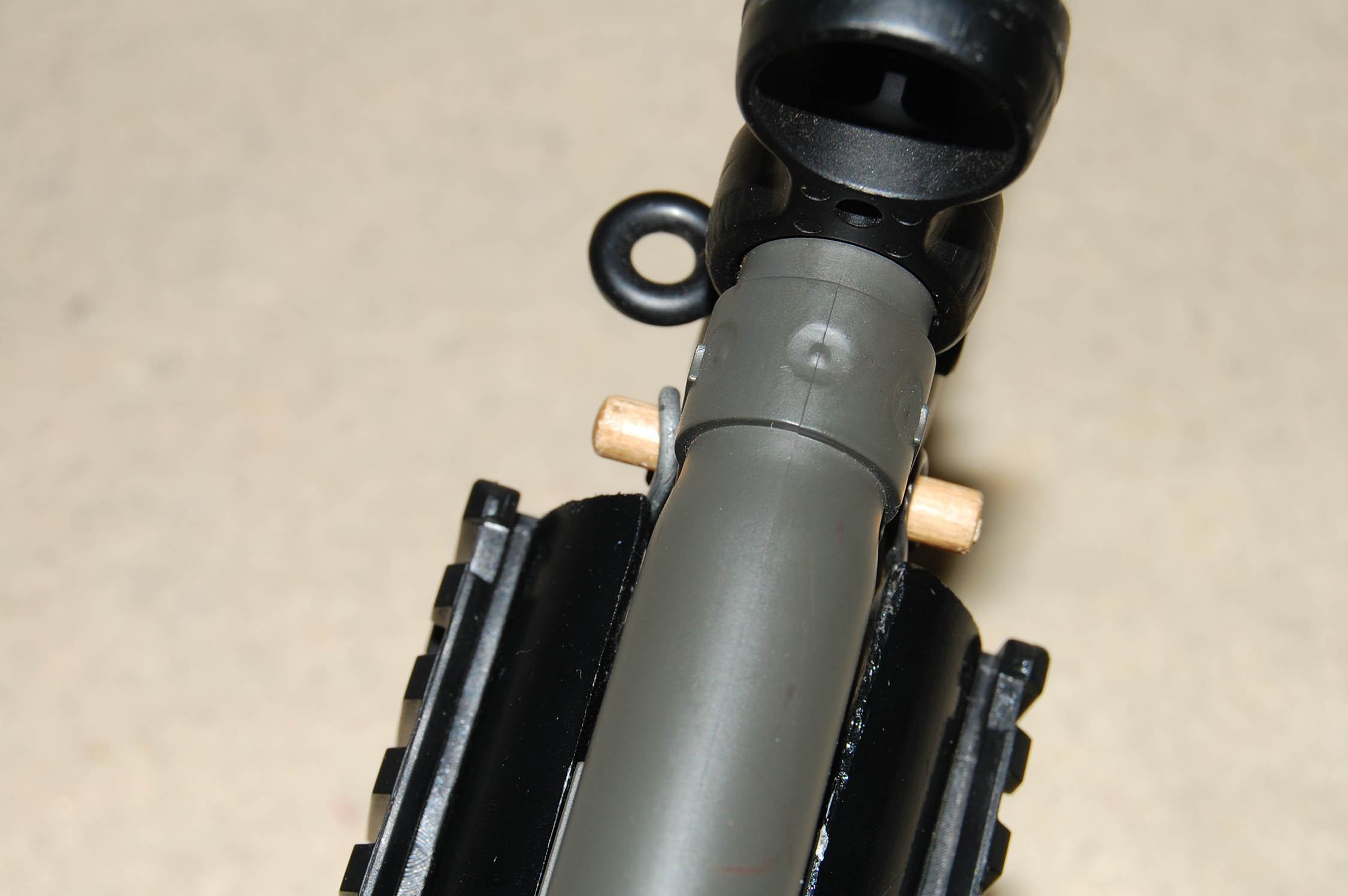 Take the M14 rail (mine is plastic - a metal one should still work, though) and slide the notches that are on it into the slits you cut into the pipe. Slide the pipe all the way to the end of the rail.